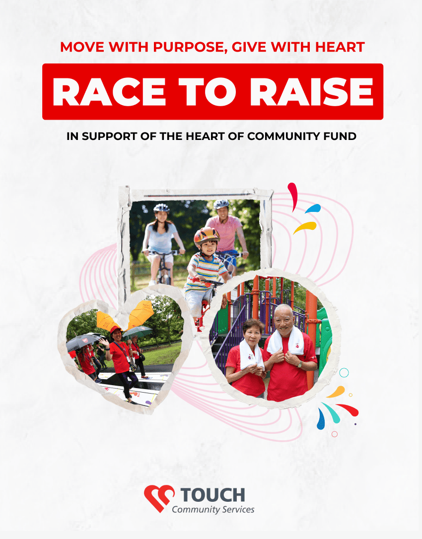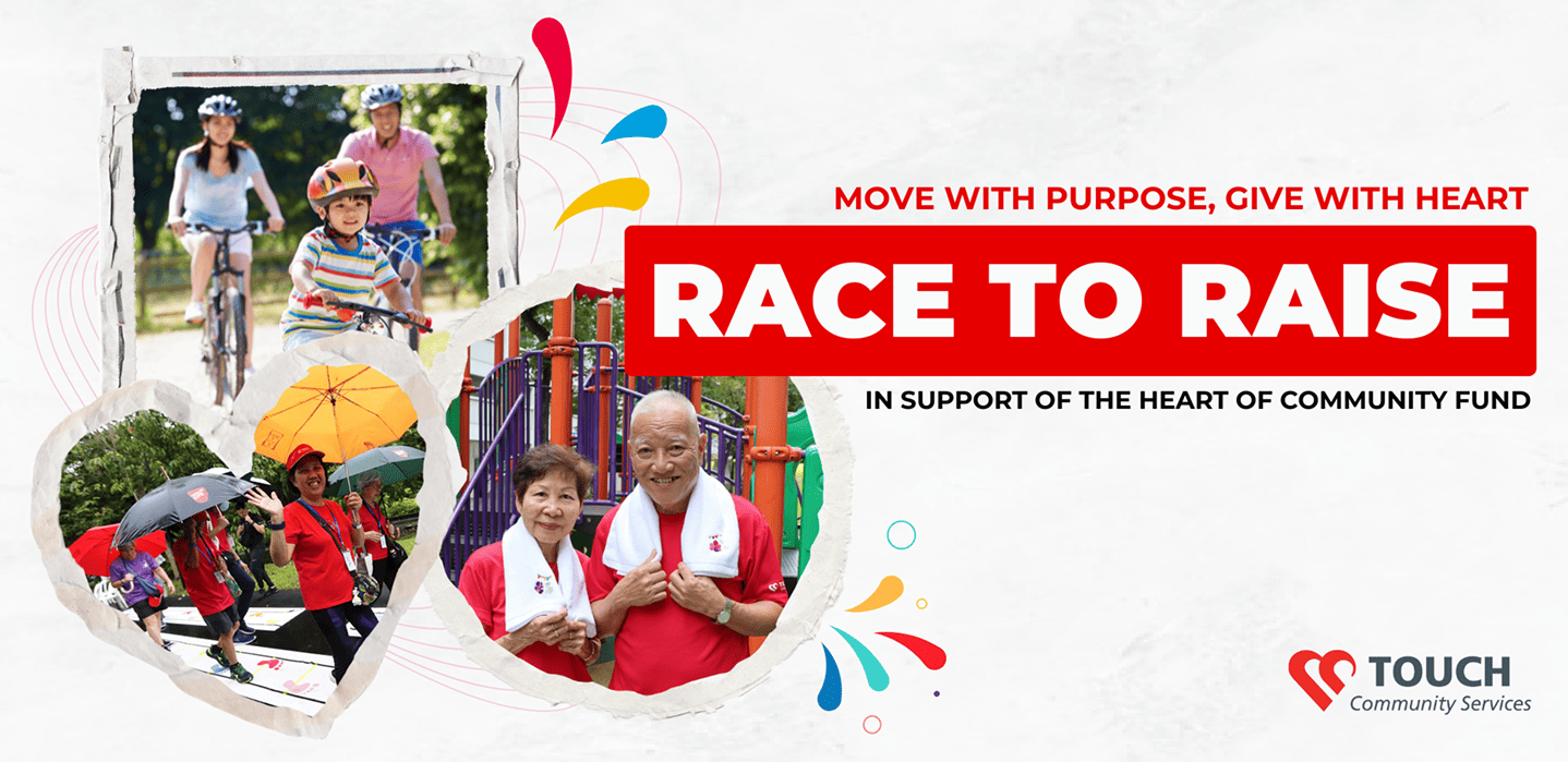 Race to Raise is about moving together. Rally your loved ones, friends, and colleagues. Turn your workouts into meaningful moments that strengthen both your body and bonds. Together, let’s make wellness a shared goal and giving a shared habit. All proceeds raised through this event goes towards supporting Heart of Community Fund by TOUCH Community Services.